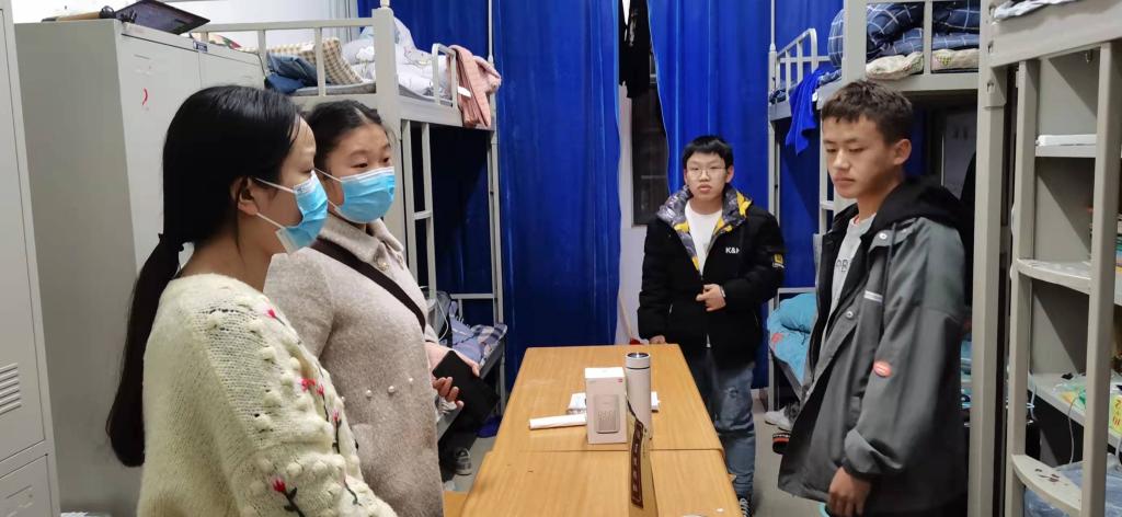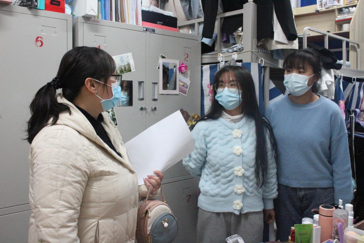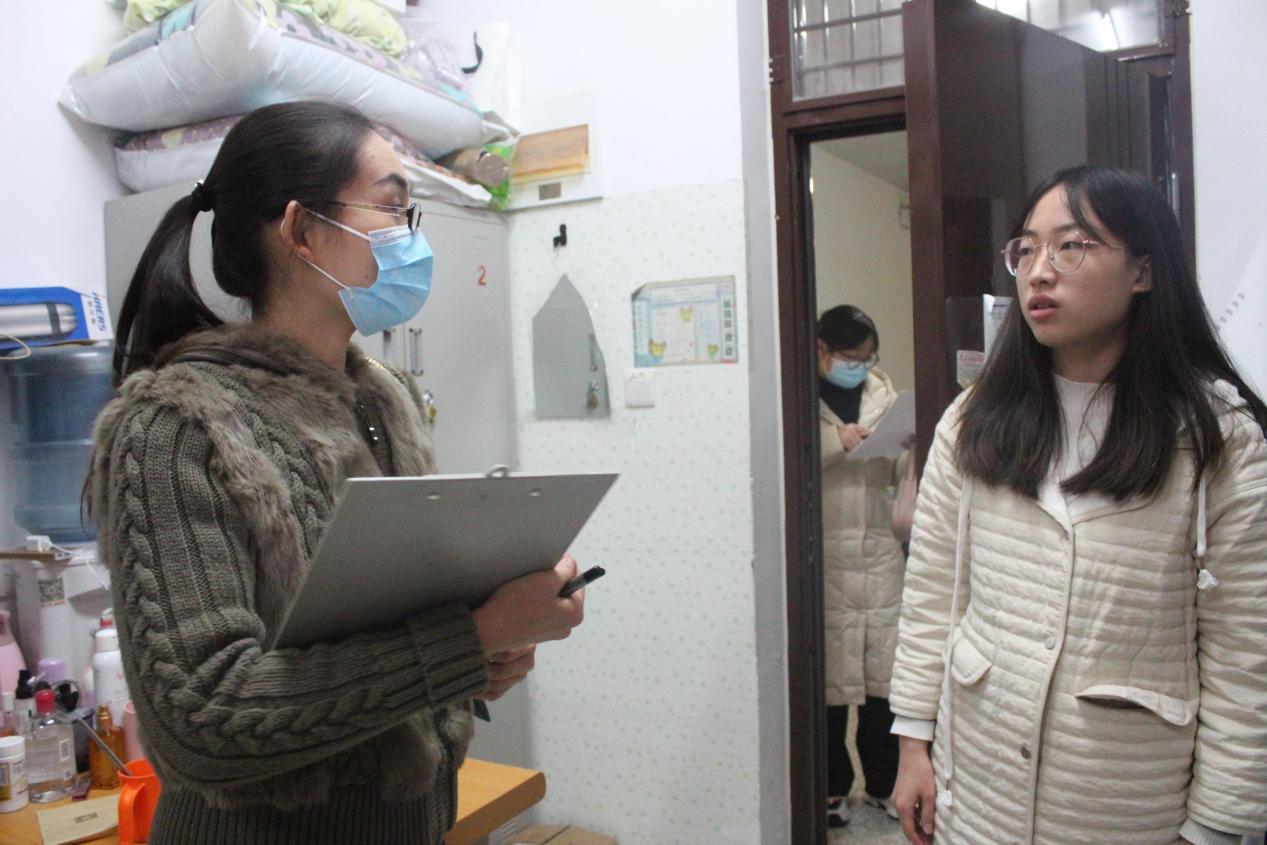 本次检查内容包括宿舍卫生和宿舍用电安全。本次检查过程中四位老师共同强调了学生宿舍内不允许使用大功率电器这一问题,并指出干净整洁的宿舍环境对学生的学习、生活和身体健康十分重要。同时,老师们也对寝室同学的学习和生活状态进行了解,并叮嘱同学们在接下来的时间里认真学习,积极向上。总体来讲,宿舍环境较好,部分宿舍内部布置很有创意。