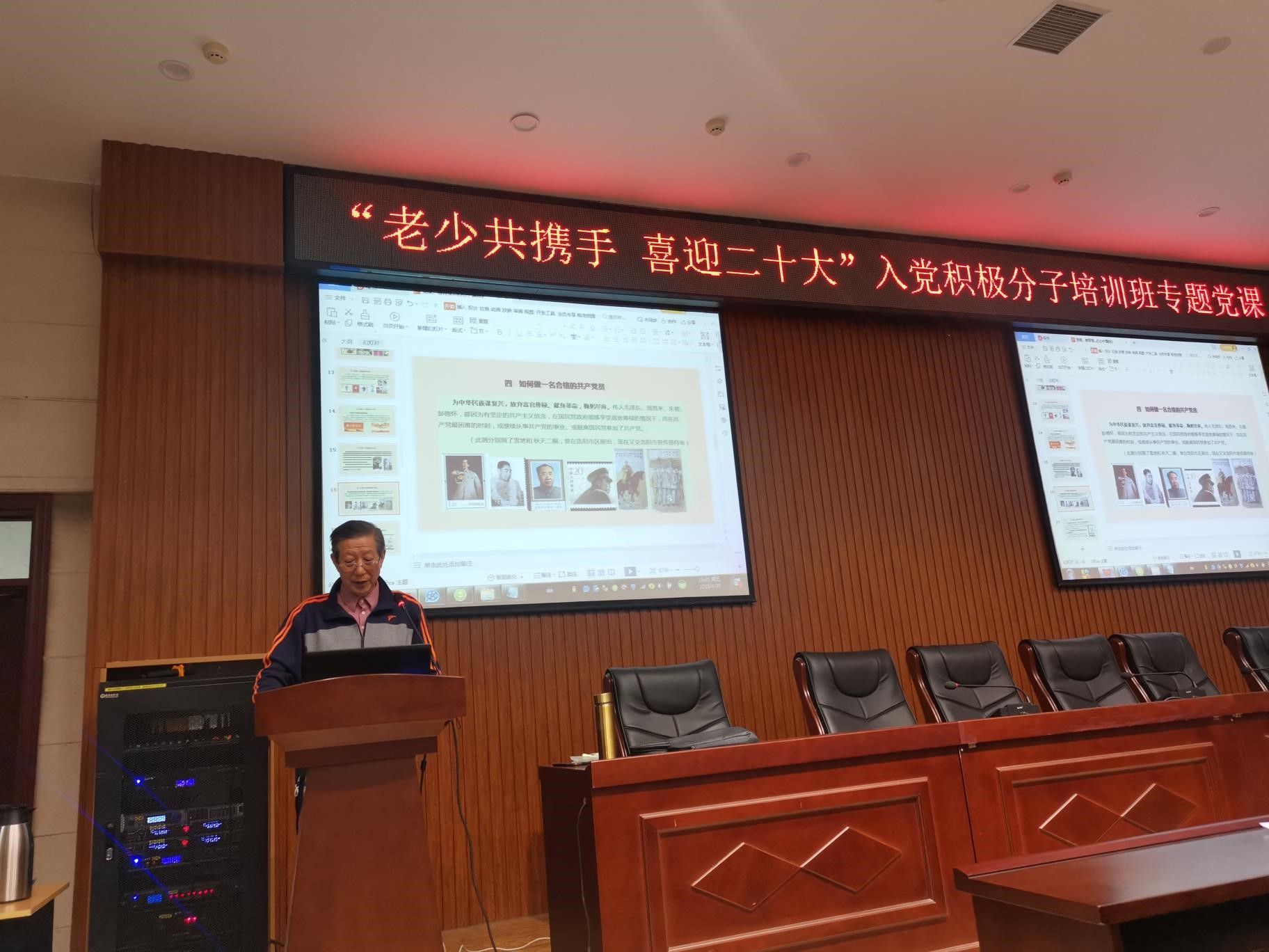 为深入学习贯彻习近平新时代中国特色社会主义思想,迎接党的二十大,4月29日,化工与制药学院于工科五-211开展“老少共携手 喜迎二十大”入党积极分子培训班专题党课活动。学院邀请到校关工委宣讲团任章留为入党积极分子讲授专题党课,院党委副书记马东辉主持, 21级辅导员张俊和恋爱动漫