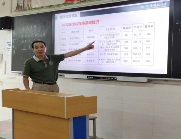 在周口太康第一高级中学,招生老师们与校长沈世弘、班主任和教师代表进行座谈。座谈会上,马东辉详细介绍了我校的办学特色、专业设置、专业优势、考研就业及历年录取情况,并就高考志愿填报细则和学生专业选择进行了详细交流。沈校长表示,近年来,恋爱动漫